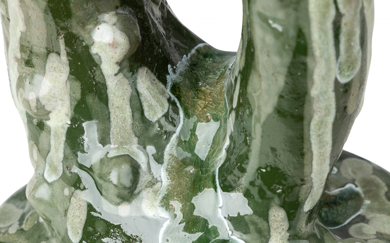 В основе — высококачественный шамот, который мастерица формовала в технике ручной лепки, создавая выразительный рельеф и уникальный рисунок поверхности. Для отделки использована глазурь кракле с эффектом тонкой сеточки трещинок, придающей изделию особый шарм и глубину цвета. Многослойное нанесение глазури позволило добиться сложной игры оттенков, которые меняются в зависимости от освещения — от глубоких тёмных тонов до тёплых, слегка золотистых бликов.