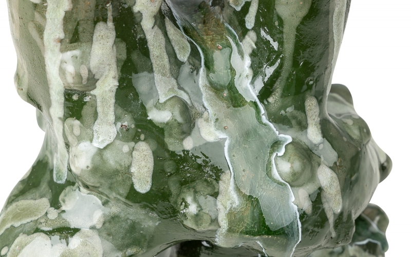 Отдельный штрих — декоративные элементы из советского стекла, найденного в заброшенном здании. Эти фрагменты не только добавляют работе текстурное и цветовое разнообразие, но и становятся символом связи времён, объединяя прошлое и современное искусство. Такой подход делает «Диковинного зверя» не просто предметом декора, а настоящим арт-объектом с историей.