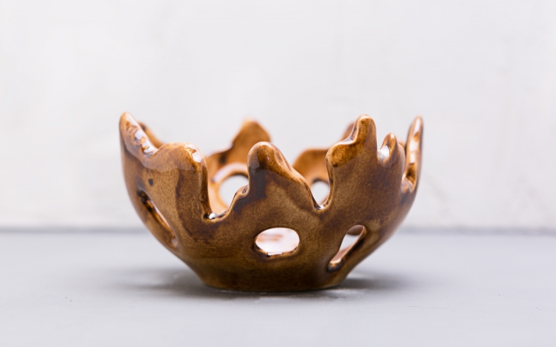 Форма чаши навеяна морскими образованиями: край повторяет изломанные линии кораллов, создавая ощущение застывшего движения. Основание плотно посажено на столешницу, а вверх чаша поднимается волнообразно, со множеством сквозных проёмов, усиливающих эффект воздушности. Диаметр чаши — 180 мм, высота — 100 мм, при весе до 1 кг. Объёмно она кажется крупнее за счёт ажурной структуры, но при этом остаётся легкой визуально и в обращении.