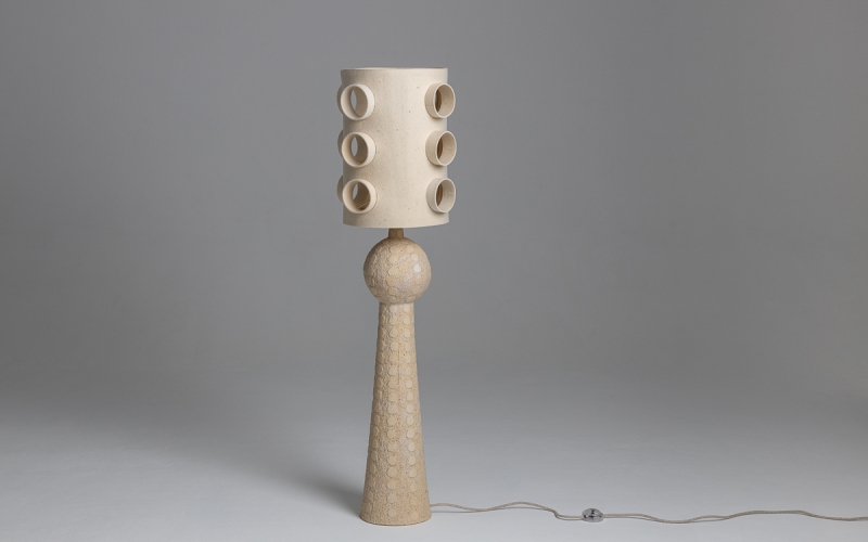 Фактура — характерная для шамота зернистая, шероховатая, с лёгким кракле и глубоким микрообъемом, создающим сложную игру света даже при выключенной лампе. Поверхность покрыта приглушённой бежево-серой глазурью с теплыми охристыми переливами, усиленными светоотражением в момент включения. Внутренний свет выходит наружу через круглые проёмы, создавая мягкие овалы света на стенах и полу — именно такая светотеневая графика становится частью общей интерьерной композиции.