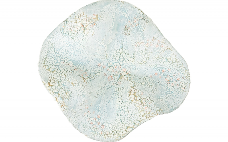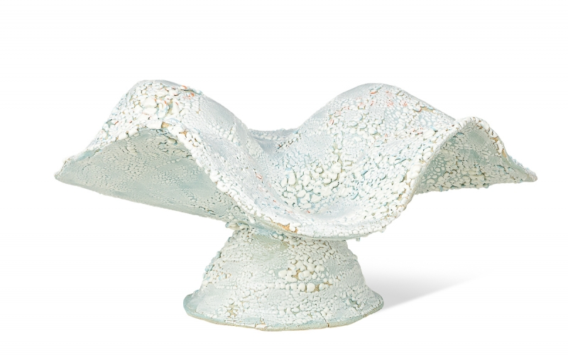 Блюдо условно делится на две части: основа — низкий грибовидный постамент, устойчивый и немного шероховатый, а основное «тело» — широкий, волнистый диск, словно парящий над поверхностью. Такая конструкция делает объект интересным для наблюдения с любого ракурса — блюдо раскрывается как визуально, так и композиционно. Это не просто предмет декора, а арт-объект, обладающий самостоятельной ценностью и эстетикой.
