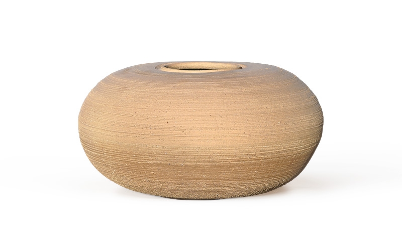 Ваза выполнена вручную из шамотной беложгущейся глины. После высокотемпературного обжига (1230°C) поверхность приобрела матовую текстуру и тёплый песочный тон с лёгким естественным блеском. Широкое округлое тело с компактным горлышком по центру придаёт изделию визуальную устойчивость и ощущение гармонии.