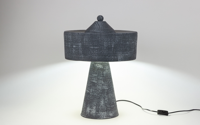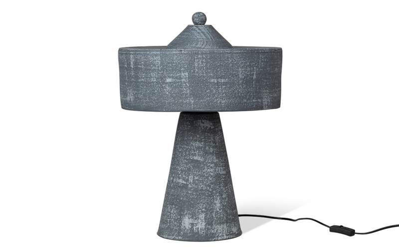 Изделие выполнено из прочной шамотной глины, прошедшей высокотемпературный обжиг. Матовая поверхность с эффектом потёртости подчёркивает графитовый цвет и фактуру глины. Строгие геометрические формы — коническое основание, цилиндр и декоративный шар — придают светильнику скульптурный характер.