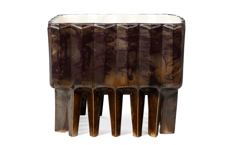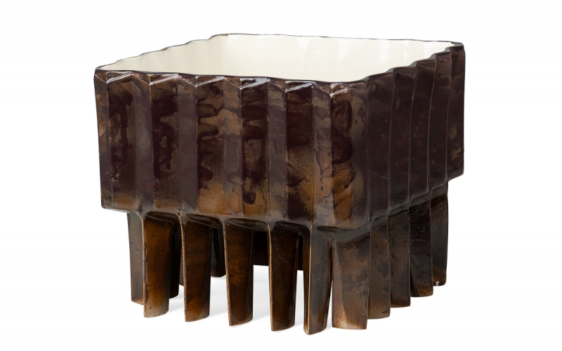 Форма изделия — прямоугольная, с мягко рифлёной вертикальной фактурой стенок. Границы верхнего края будто слегка нарушают правильность, отсылая к живому, «неспокойному» силуэту жилого дома. Девять опорных ножек расположены с расчётом на равномерное распределение веса даже при полной загрузке. Это особенно важно, если чаша используется как кашпо для комнатных растений или как композиционный элемент на столе.