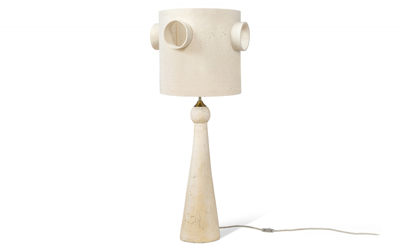 Напольный светильник выполнен как скульптурный объект, находящийся на границе дизайна и архаической пластики. Его вытянутая тотемная форма и нарочито грубая поверхность отсылают к древним культовым объектам и примитивистской скульптуре, переосмысленным через язык модернизма и современного ремесленного дизайна. Свет здесь становится не столько функцией, сколько частью образа — знаком присутствия, веса и тишины.